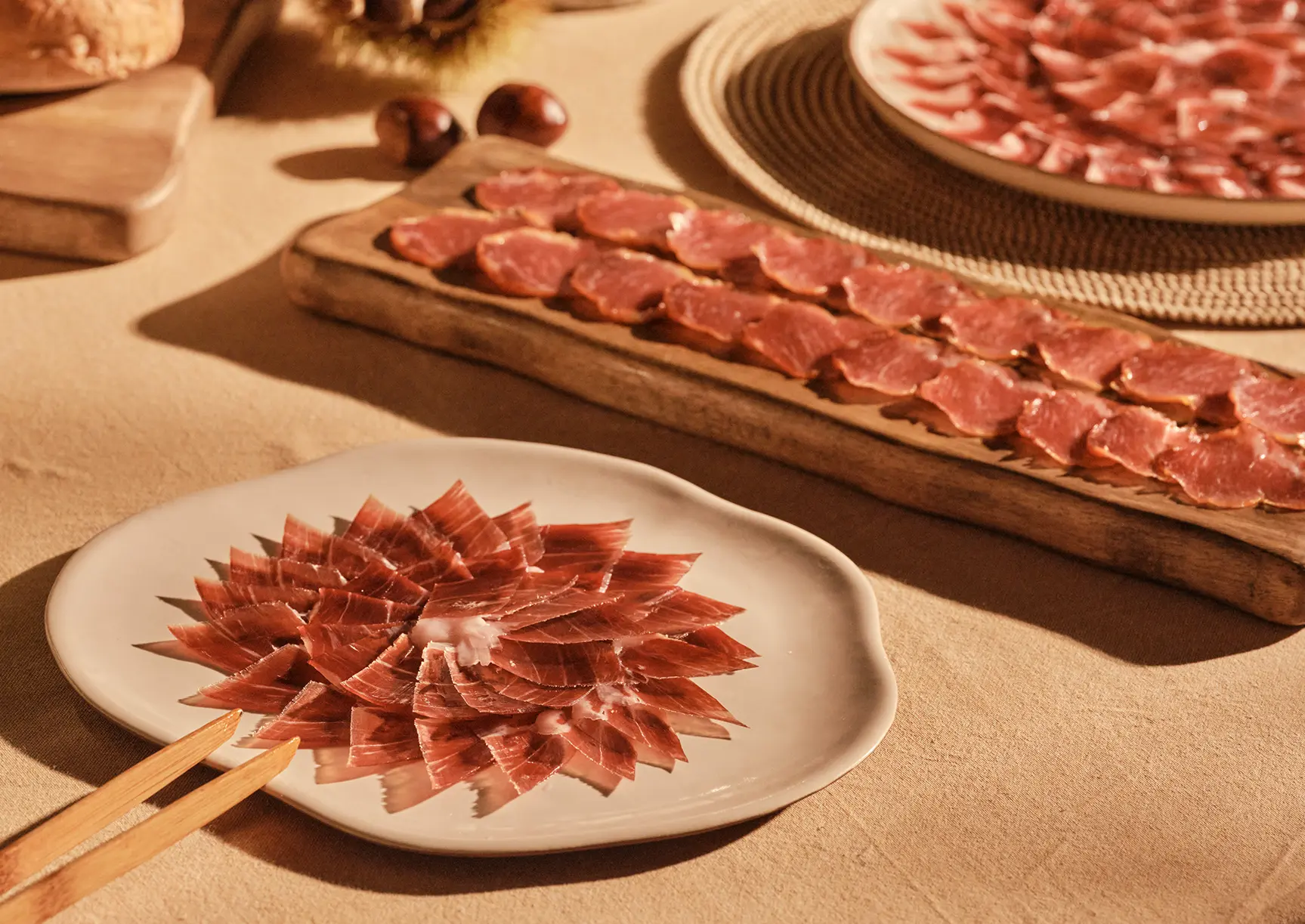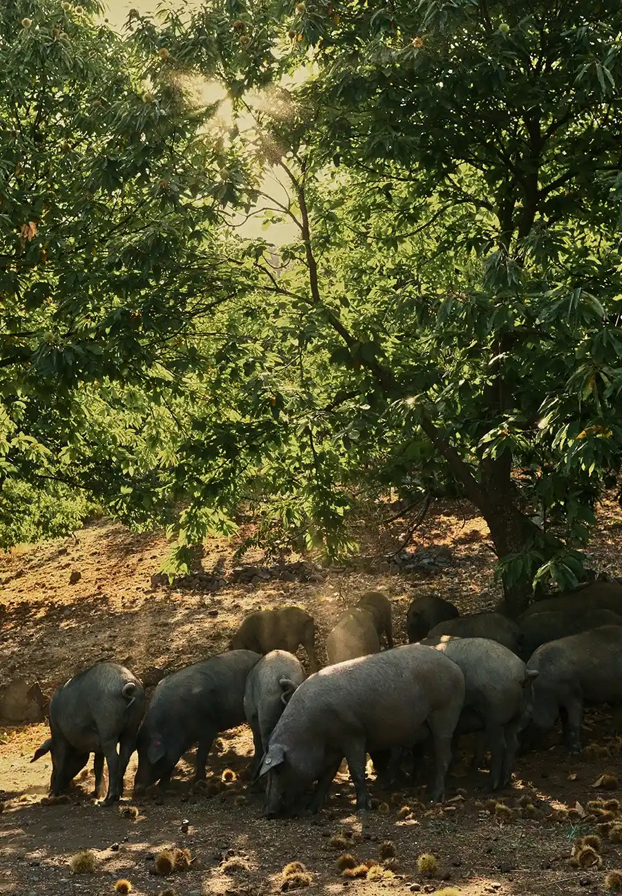 Las fincas están en la segunda zona productora de castañas de España y los cerdos 100% ibéricos disfrutan de una exclusiva pre-montanera de castaña que le aporta a la carne un dulzor especial y unos matices inigualables.