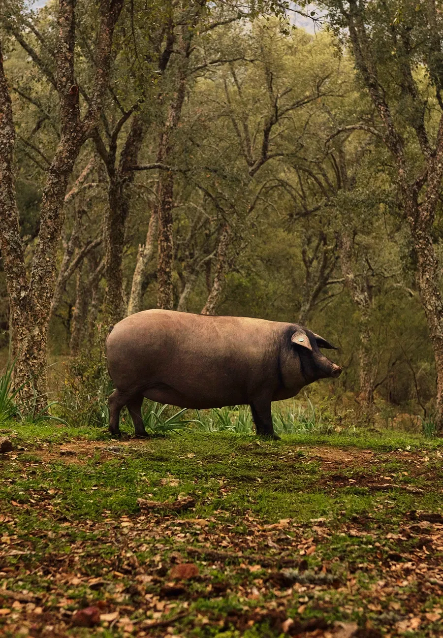 Nuestros cerdos son auténticos atletas, el accidentado relieve les obliga a realizar ejercicio continuo en su búsqueda de alimento, lo que favorece al bienestar animal y a la penetración del oleico intramuscularmente. La carne de nuestros jamones ibéricos alcanza una calidad y unos niveles de infiltración inigualables.