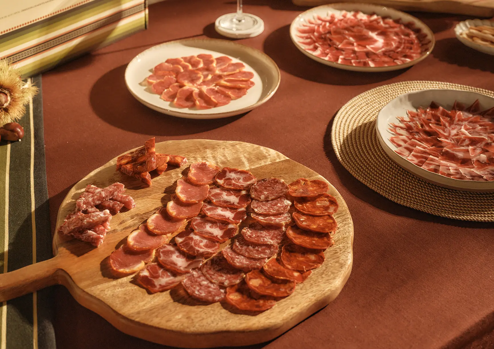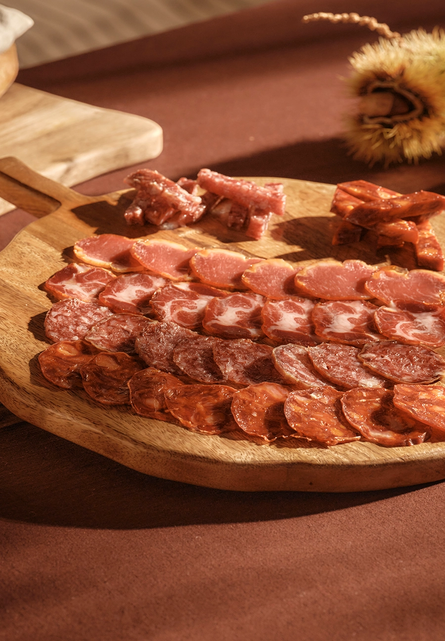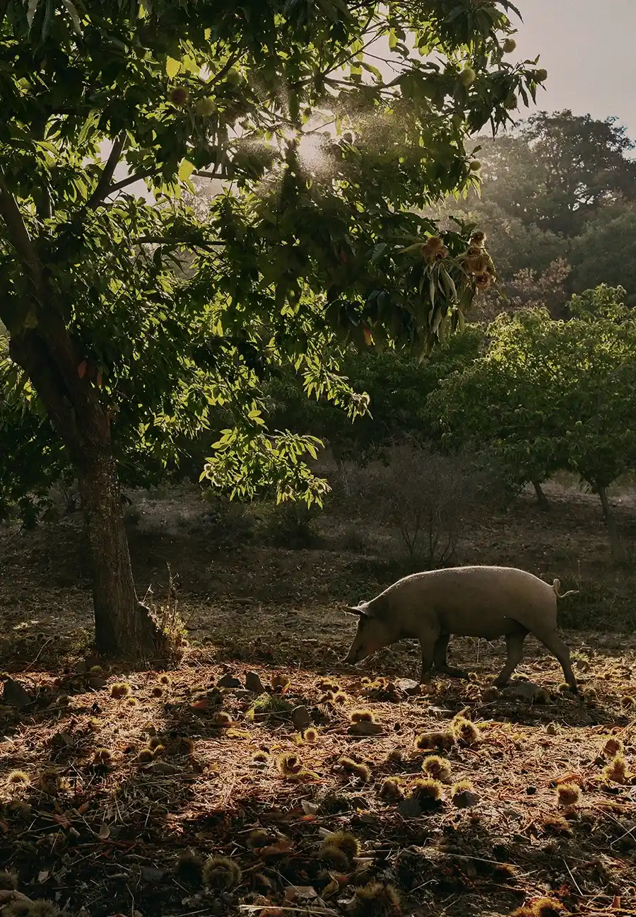 Nuestra dehesa es rica en castaños, y durante más de un mes, el anterior a los meses de alimentación exclusiva de bellota, nuestros cerdos se sacian de castañas en una premontanera única que aporta a la carne un dulzor especial y unos matices diferentes y extraordinarios.