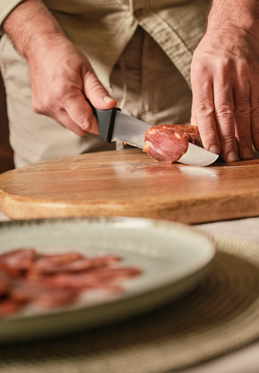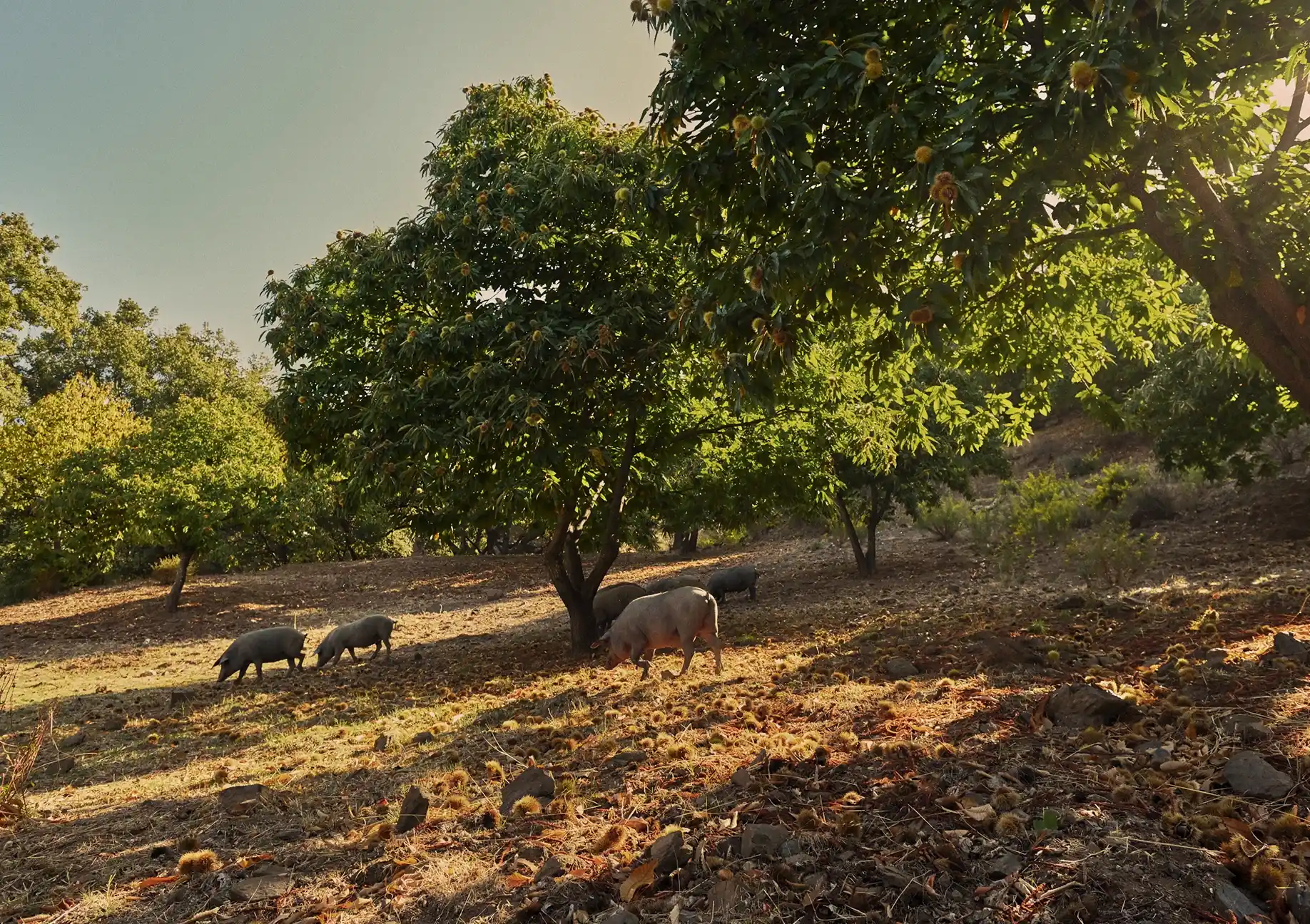 Nuestra dehesa es rica en castaños, y durante más de un mes, el anterior a los meses de alimentación exclusiva de bellota, nuestros cerdos se sacian de castañas en una premontanera única que aporta a la carne un dulzor especial y unos matices diferentes y extraordinarios.
